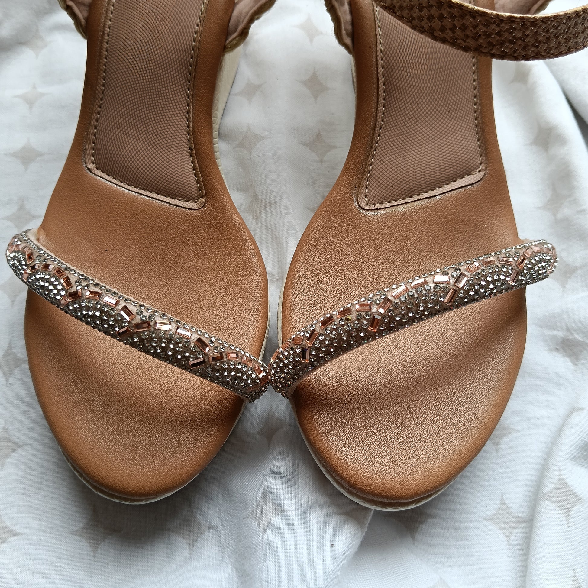Material superior: Tira frontal con pedrería brillante + correa trenzada sintética.